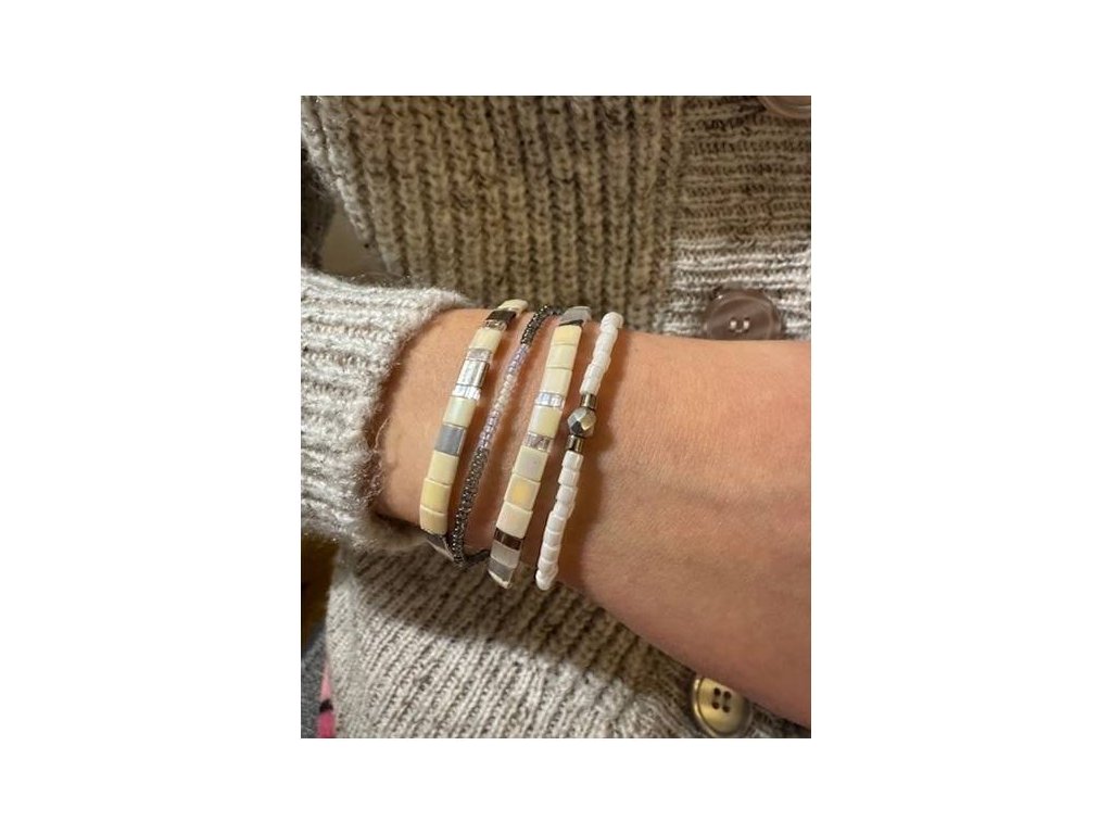 Náramky jsou vytvořené z japonských skleněných korálků Miyuki a ploškových korálků Tila, které dodávají setu moderní, čistý výraz. Při pohybu se jemně odráží světlo a náramky tak vypadají krásně jak v denním, tak i v umělém osvětlení.