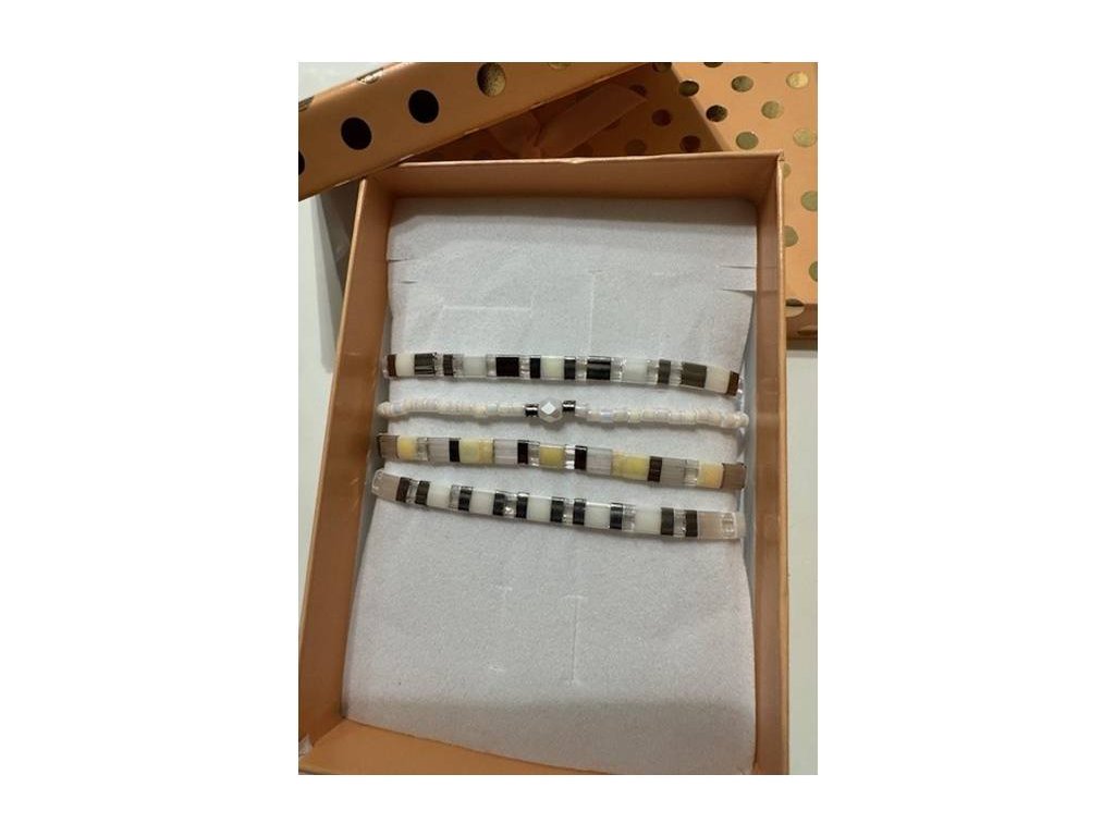 Pokud milujete minimalismus a čisté linie, náš luxusní set čtyř ručně vyráběných náramků vás nadchne. Kombinace bílé a stříbrných tónů z japonských korálků Miyuki působí svěže, nadčasově a na ruce krásně vynikne díky jemným odleskům při každém pohybu. Náramky jsou ideální pro vrstvení, ale snadno je unosíte i samostatně – podle outfitu i nálady. Ideální jako krásný dárek v elegantním balení.