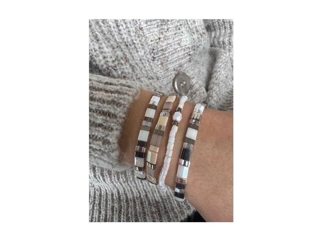 Set je tvořený z japonských skleněných korálků Miyuki a ploškových korálků Tila, které vytváří čisté linie a jemně geometrický vzhled. Vrstvení všech čtyř náramků působí promyšleně, ale pokud chcete minimalističtější detail, stačí zvolit jeden nebo dva.
