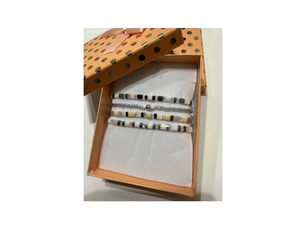 Máte-li rádi minimalismus v jemných neutrálních tónech, náš luxusní set čtyř ručně vyráběných náramků vám bude dělat radost každý den. Kombinace stříbrné, bílé a krémové z japonských korálků Miyuki působí čistě, nadčasově a na ruce krásně vynikne díky drobným odleskům při každém pohybu. Set je ideální pro vrstvení, ale jednotlivé náramky snadno unosíte i samostatně podle nálady a outfitu. Ideální jako krásný dárek v elegantním balení.