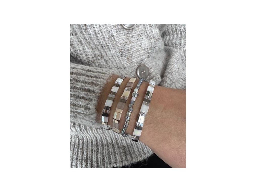 Náramky jsou tvořené z japonských skleněných korálků Miyuki a ploškových korálků Tila, které vytváří jemně geometrický vzhled a krásně odráží světlo. Když je navrstvíte dohromady, získáte výraznější celek; když zvolíte jen jeden nebo dva, vznikne decentní detail, který se hodí kamkoli.