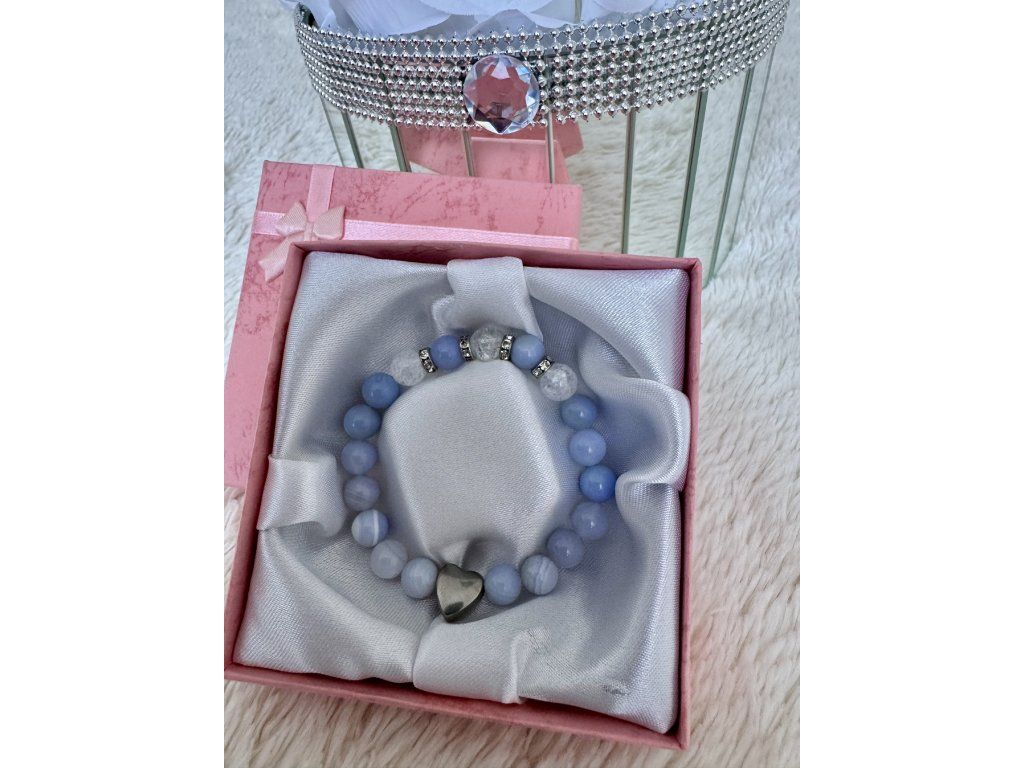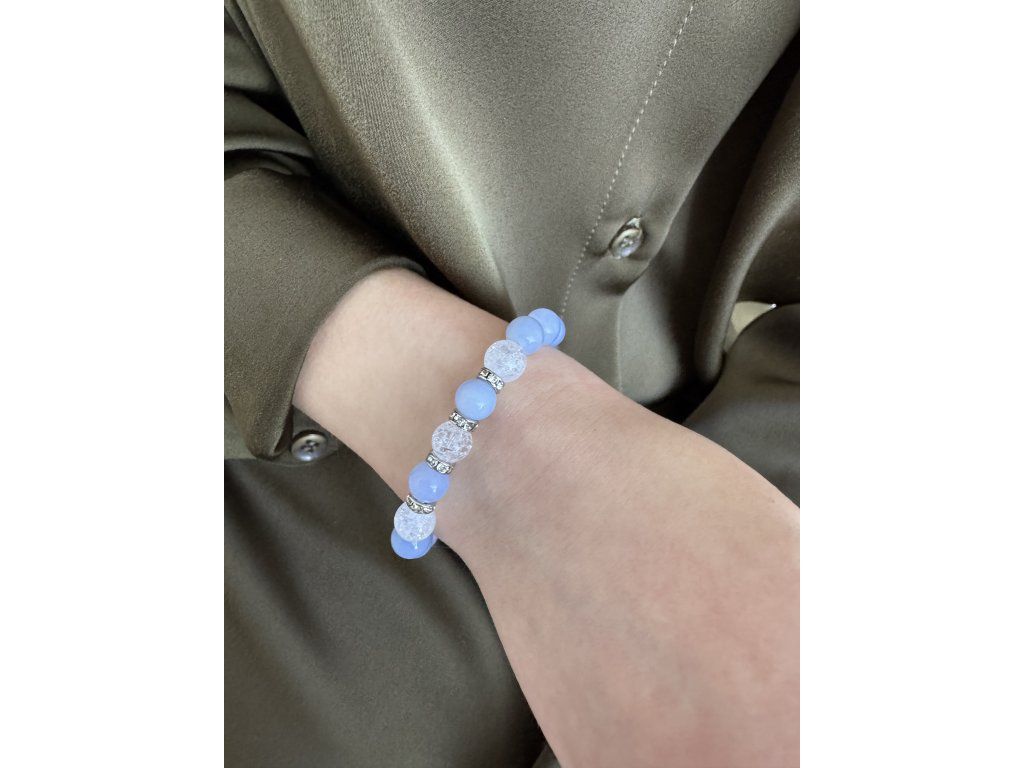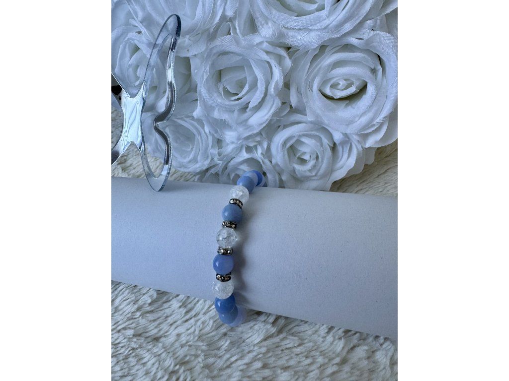 Modrý energetický minerální náramek z achátu a praskaného křišťálu. Nechte se unést klidnou silou modré energie s minerálním náramkem z achátu a praskaného křišťálu. Tento elegantní doplněk v sobě spojuje harmonii, vyrovnanost a jemnou očistu, která podpoří vaši mysl i vnitřní pohodu.Achát je kamenem stability, ochrany a uzemnění. Pomáhá uklidnit mysl, zmírnit napětí a dodat pocit jistoty v každodenním životě. Modrý odstín navíc podporuje klid, komunikaci a vnitřní rovnováhu. Praskaný křišťál přináší energii očisty a nových začátků – projasňuje myšlenky, posiluje pozitivní naladění a zesiluje účinky ostatních kamenů.