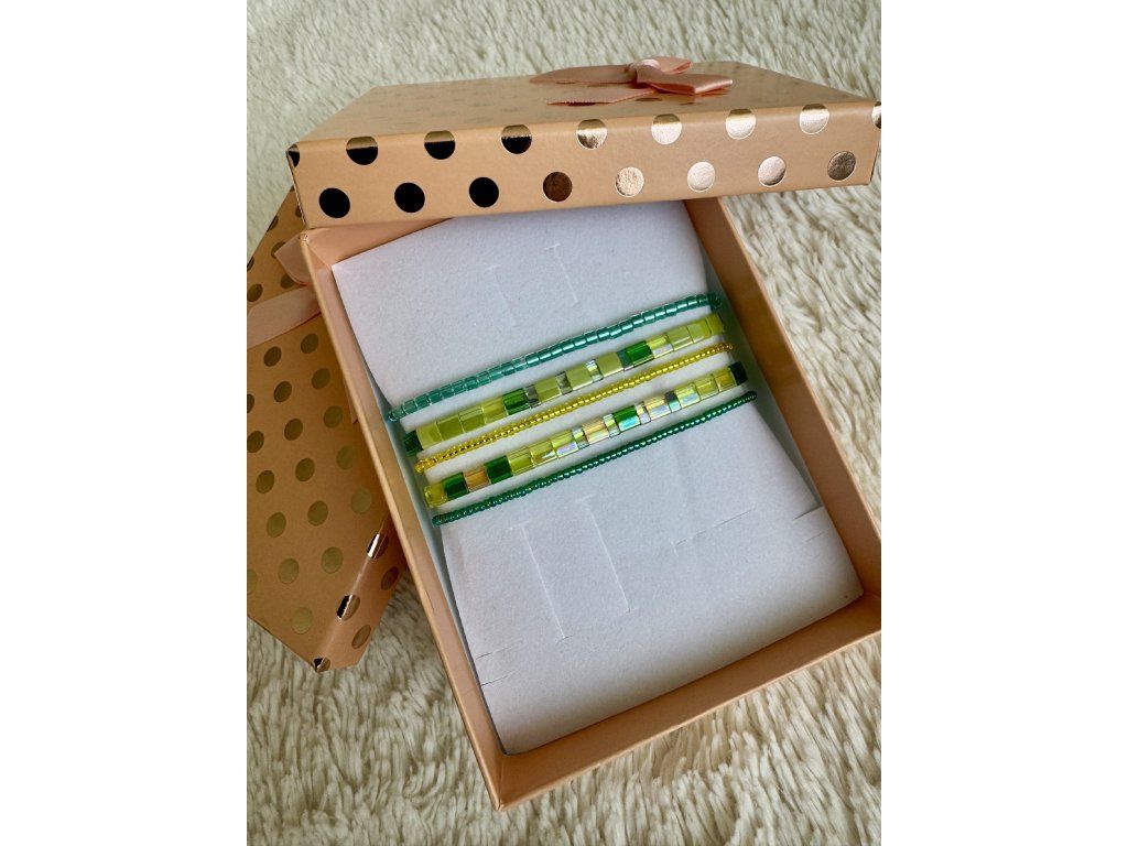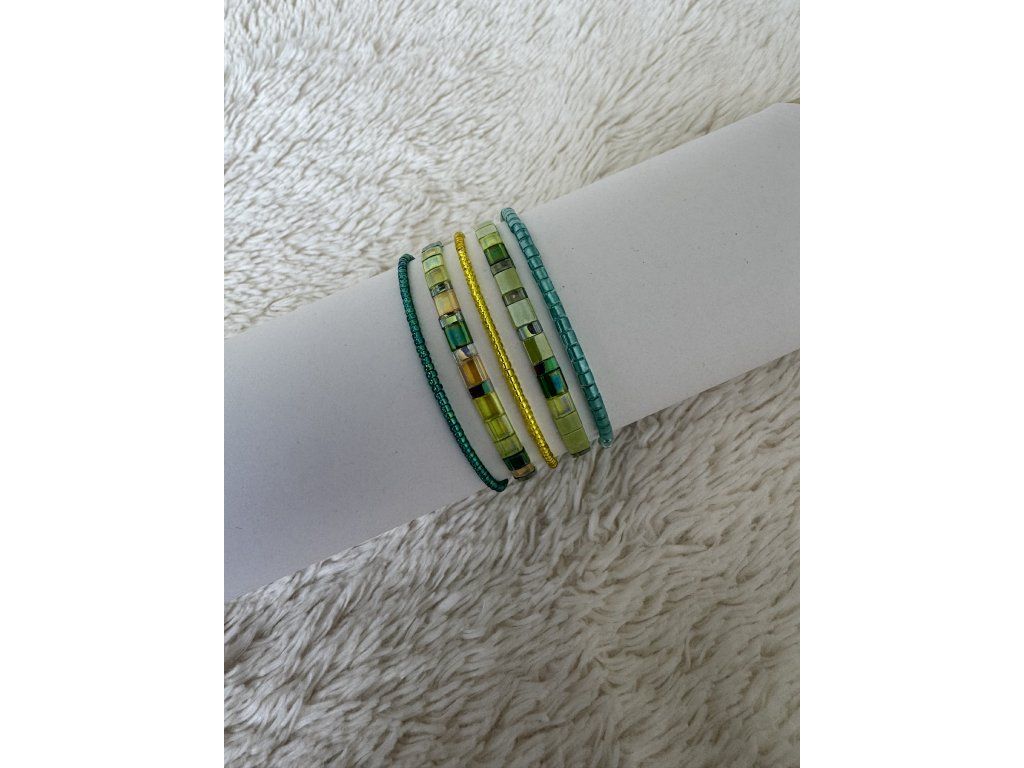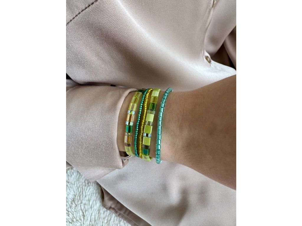 Dopřejte si náš luxusní set ručně vyráběných náramků, který podtrhne jemnou ženskou eleganci. Kombinace zeleno-žlutých tónů s detaily z japonských korálků Miyuki vytváří nadčasový šperk, jenž působí čistě, elegantně a výrazně na každé ruce.Skvěle se nosí samostatně i ve vrstvení – podle vaší nálady i outfitu. Ideální jako stylový dárek v elegantním balení.