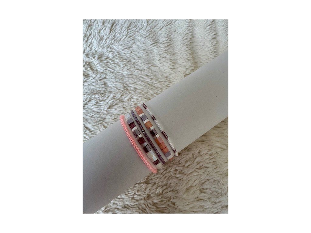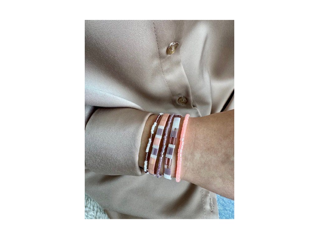 Dopřejte si luxusní set pěti ručně vyráběných náramků, který podtrhne jemnou ženskou eleganci. Lososově hnědé tóny v kombinaci s bílými detaily z japonských korálků Miyuki vytvářejí nadčasový šperk, který působí jemně, přirozeně a velmi elegantně. Na ruce krásně vynikne při každém pohybu a dodá vašemu stylu teplý a sofistikovaný akcent.