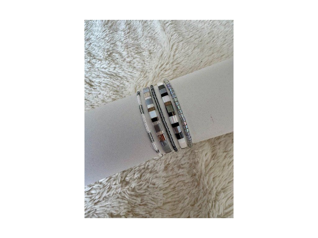 Dopřejte si luxusní set čtyř ručně vyráběných náramků Black White, který podtrhne jemnou ženskou eleganci. Černo-bílé tóny v kombinaci se stříbrnými detaily z japonských korálků Miyuki vytvářejí nadčasový šperk, který působí čistě, světle a velmi elegantně. Na ruce krásně vynikne při každém pohybu a dodá outfitu stylový kontrast.