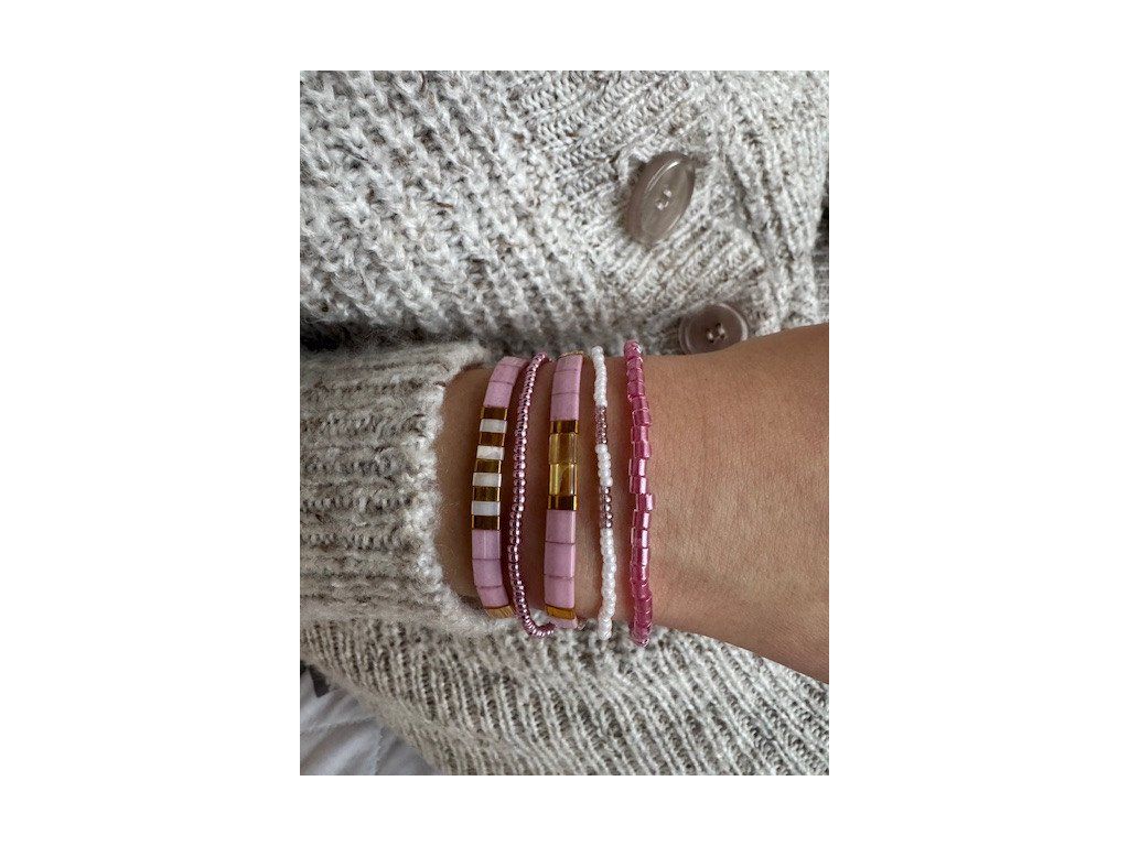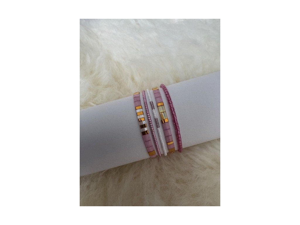 Dopřejte si luxusní set pěti ručně vyráběných náramků, který podtrhne jemnou ženskou eleganci. Zlato-růžové tóny v kombinaci se stříbrnými detaily z japonských korálků Miyuki vytvářejí nadčasový a elegantní šperk, který působí jemně, světle a velmi ženským dojmem. Na ruce krásně vynikne při každém pohybu a dodá vašemu stylu sofistikovaný a romantický nádech.